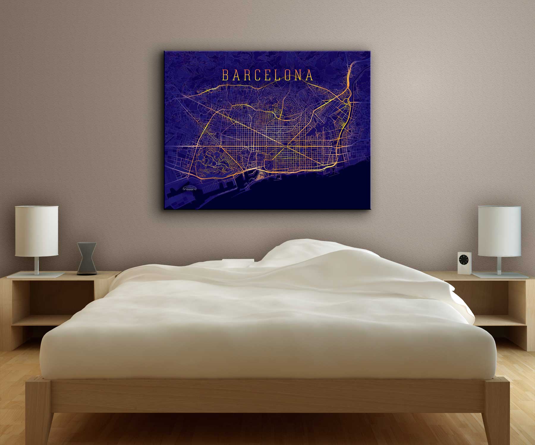 Bring the capital of the Catalonia region to your living or office space. This beautiful gallery-wrapped canvas print highlights Barcelona’s city map with artistic flair. Our canvas prints are wrapped around a hard, high-density wood fiberboard and plastic frame. This Barcelona canvas comes in a variety of styles.
