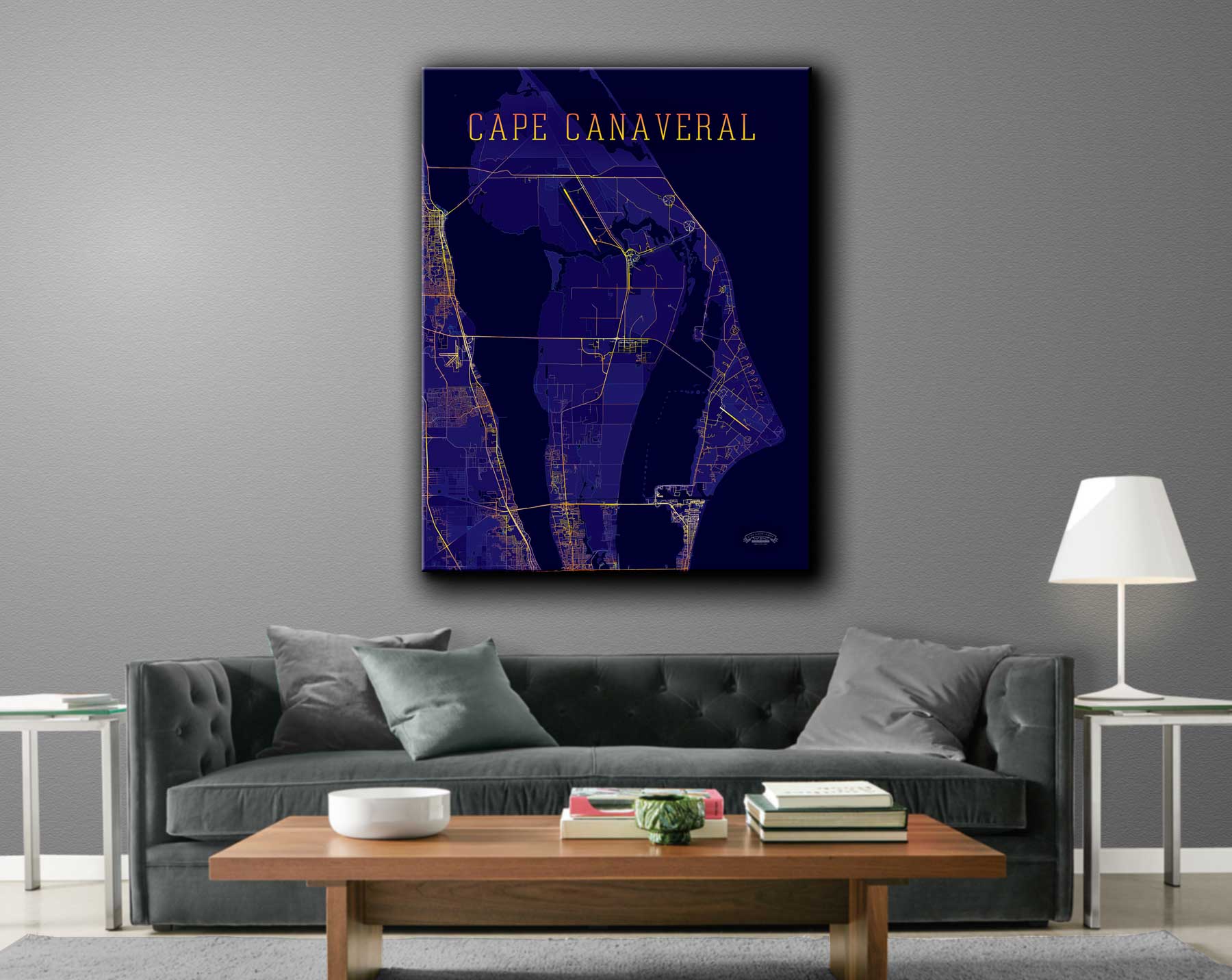Bring Cape Canaveral to your living or office space. This beautiful gallery-wrapped canvas print highlights Cape Canaveral’s city map with artistic flair. Our canvas prints are wrapped around a hard, high-density wood fiberboard and plastic frame. This Cape Canaveral canvas comes in a variety of style options.